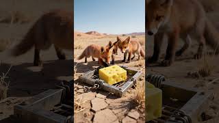English A tense and curious scene unfolds in the wilderness. Three young foxes gather around an unusual object, baited with a …