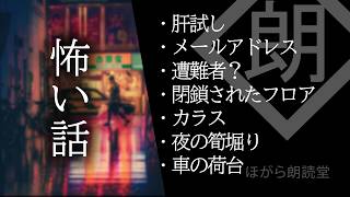 【朗読】怖い話まとめ・筍 2026/3/31 怖い話 スポンサーリンク 【朗読】怖い話まとめ・筍 00:00 肝試し 04:59 メールアドレス 11:45 遭難者? 15:50 閉鎖されたフロア 23:09 カラス 32:52 夜の筍堀り 38:42 車の荷台 …